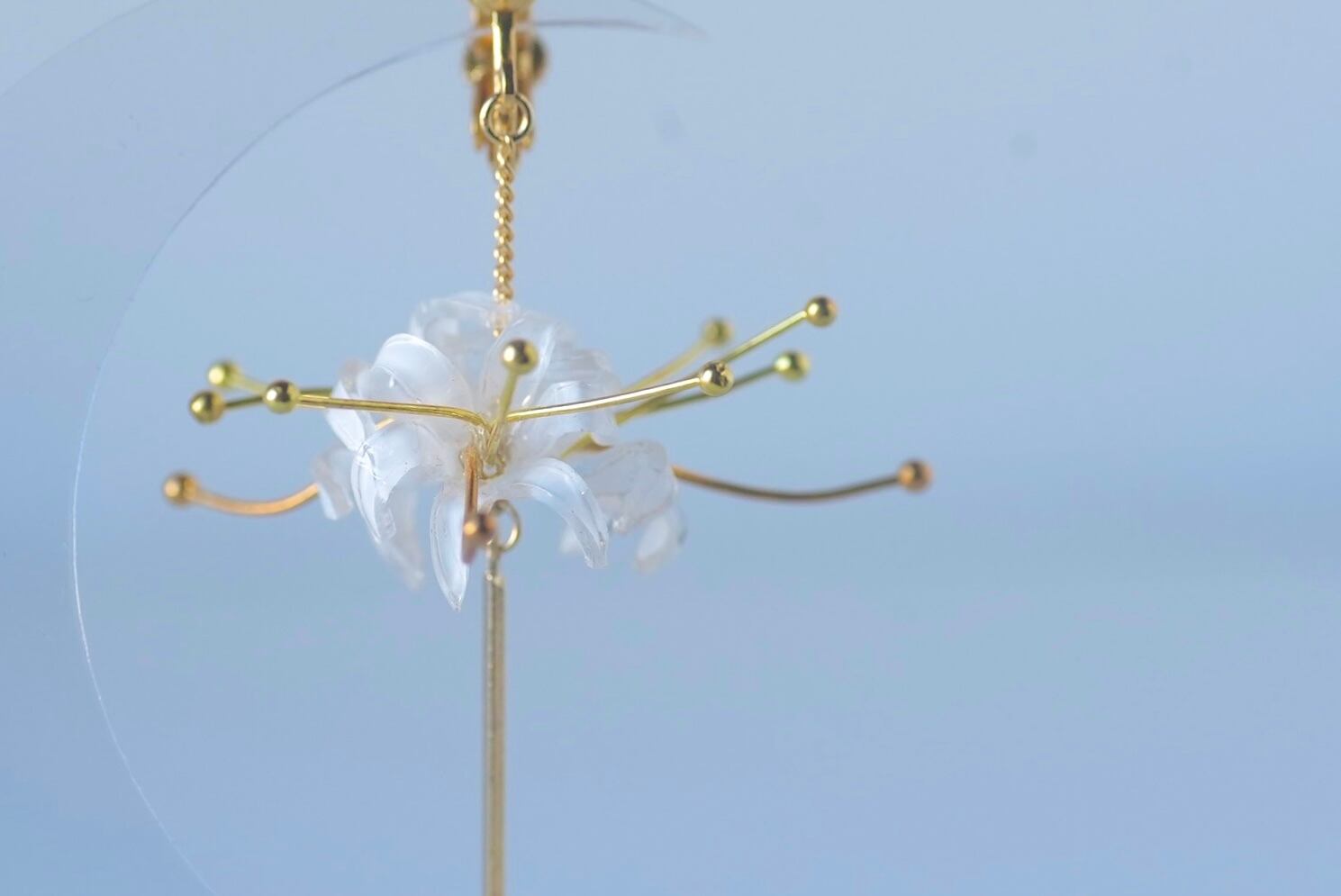 アクリルで形成したネリネモチーフのアクセサリー。