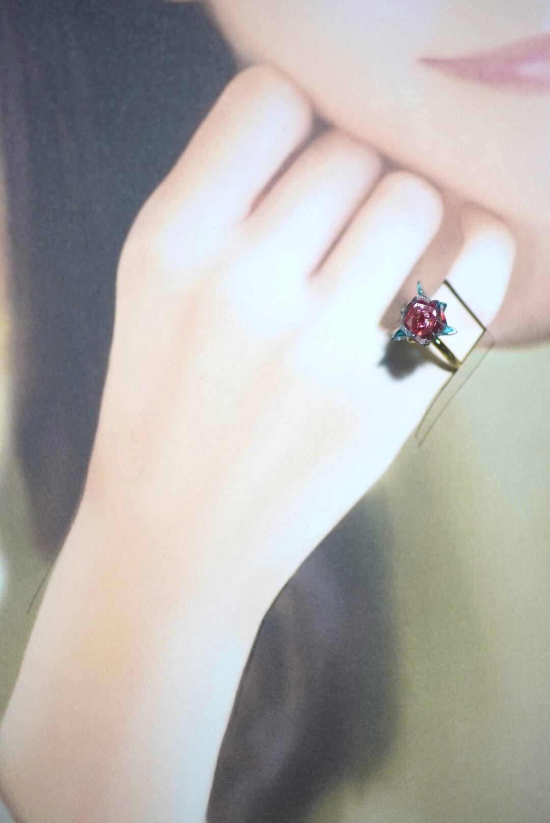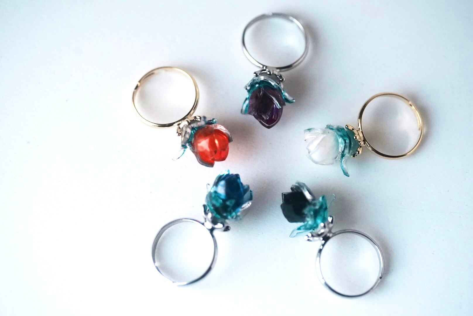 一つ一つ薔薇の形に形成した鮮やかなリング。